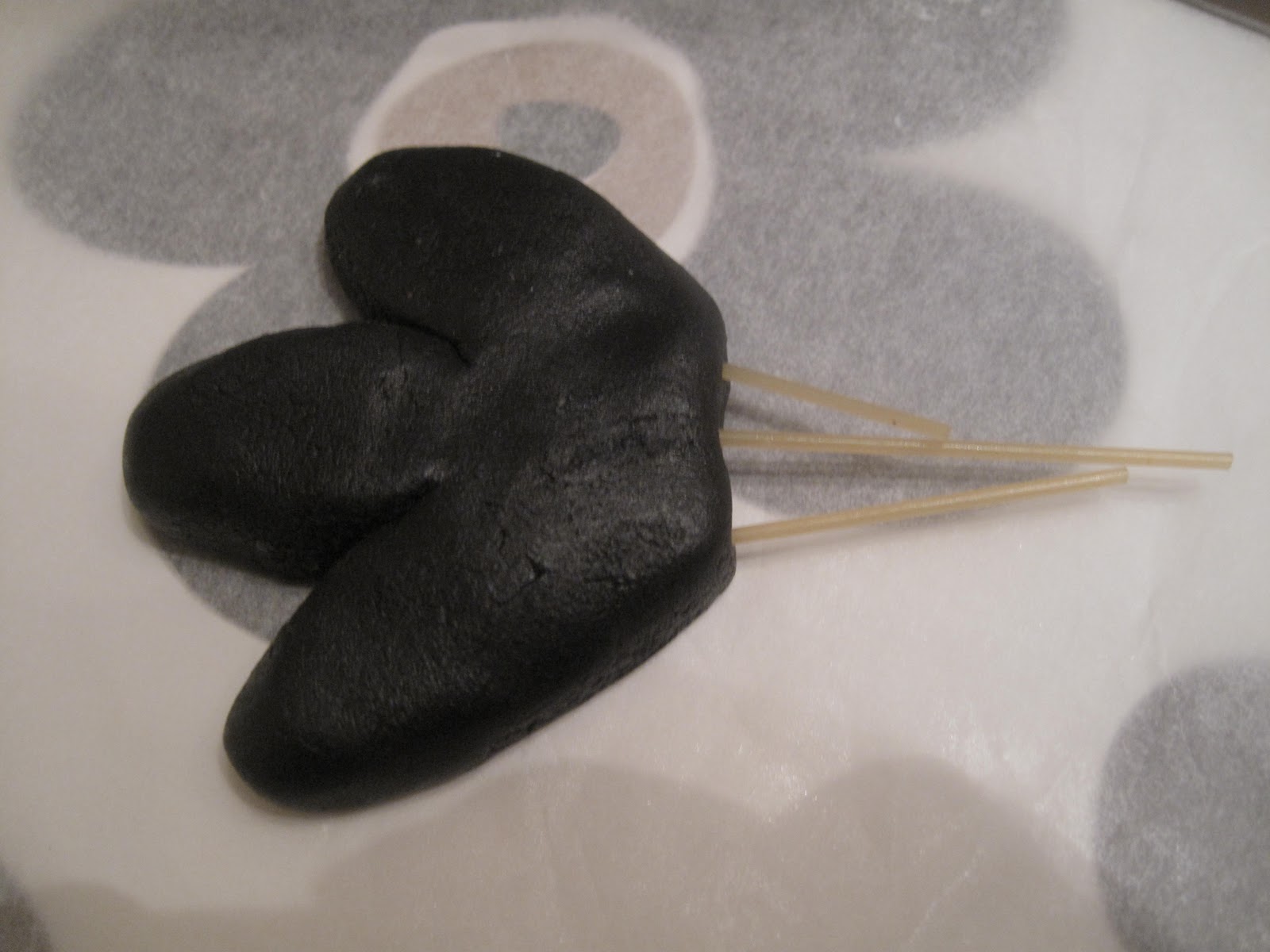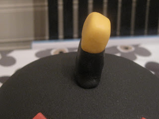 Jeg har brukt svart marsipan, grå marsipan (blandet hvit og svart), gul marsipan og litt rød og hvit marsipan.