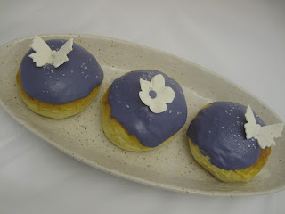 Så lovte jeg en ny vri på boller, dette er en fin variant å bruke til alle slags anledninger. Bare fantasien som setter grenser i forhold til pynting:-) Ta 1,5 dl melis og blande med 2-3 ts melk eller vann, og noen dråper sitronsaft. Ha i pastafarge etter ønske, her ble det lilla:-)
