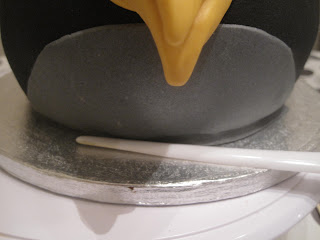 Lim på nebbet med spiselig lim. Jeg satte også inn en kort tre pinne som støtte under nebbet og inn i kaken. Juster nebbet så set ser bra ut! Da skal «magen» dekkes… Skjær til grå marsipan og legg inntil, ha spiselig lim eller litt vann som feste