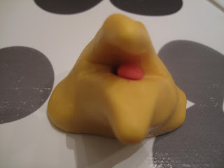 Så må jo fuglen ha et nebb:-) Ta en klump gul marsipan og form sånn, skjær med en kniv et stykke nedi. Men ikke skjær helt igjennom… Kan evt tilsette litt CMC/Tylose i klumpen så det blir mere hold i den