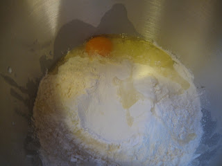 Ha det tørre oppi melken og gjæren i mikseren, hold igjen litt av melet i tilfelle det ikke trengs. Veldig viktig å ikke tilsette alt melen med engang. Deigen skal være litt klissete. Tilsett 1 egg