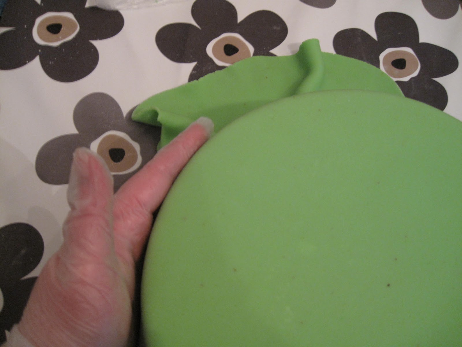 Legg fondanten over kaken. Ha en stor leiv for da er det så mye enklere å få et fint lokk uten skrukker