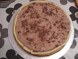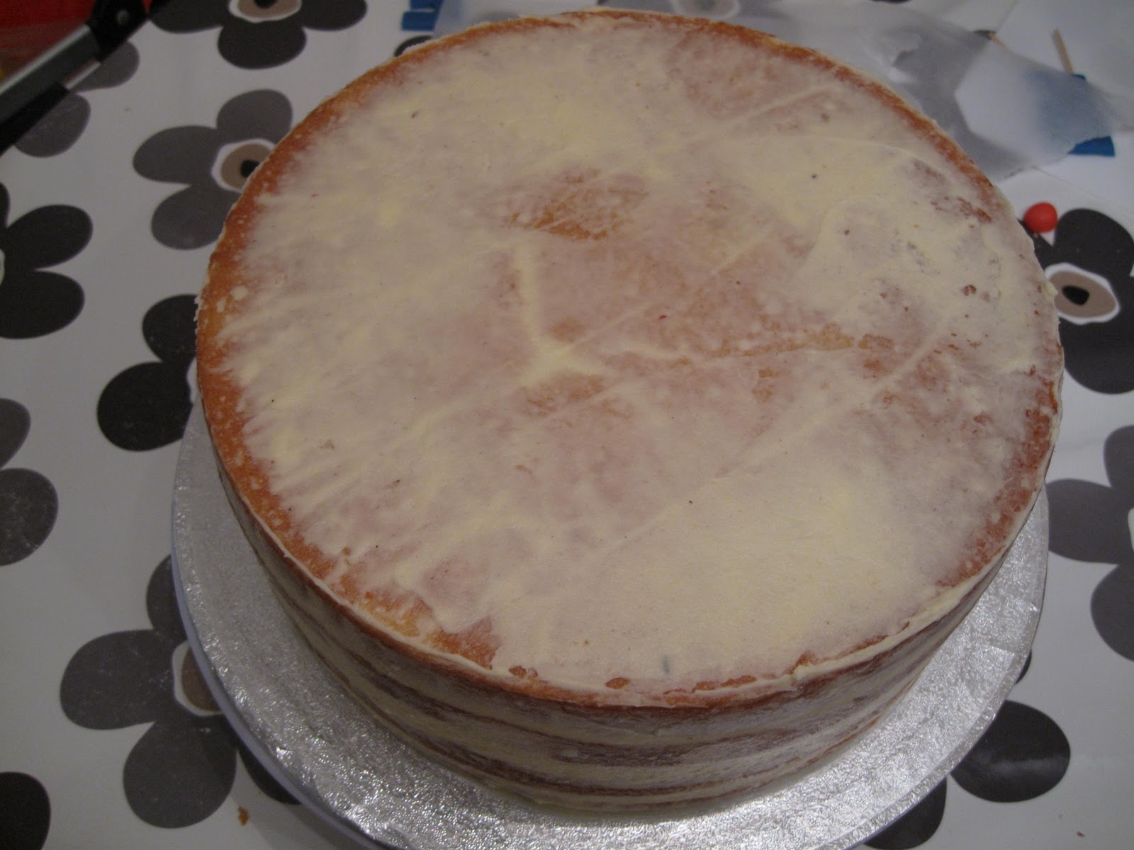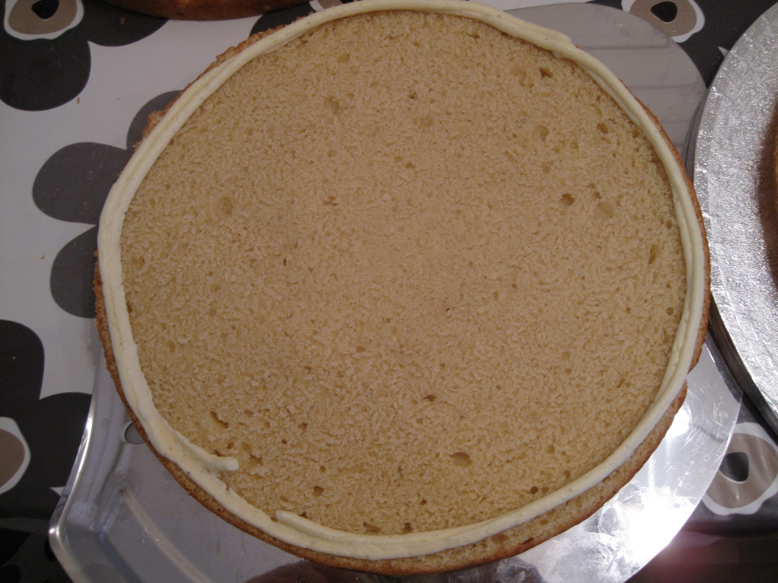 Så legges den andre del av den kaka oppå, nå ligger altså kaken som den lå i ovnen når den ble stekt. Smør et nytt lag med fyll