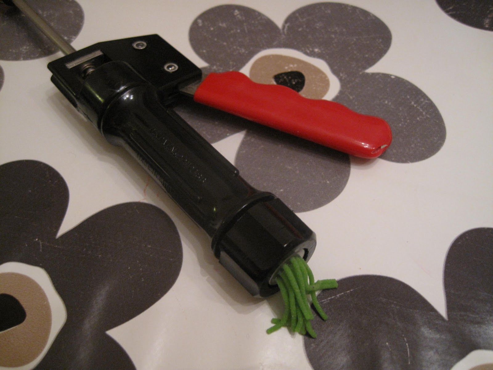 Klem godt inntil hele veien mens du drar hånden nedover. Beste redskapet her er hendene med engangshansker. Å kjøp vinyl hansker, ikke lateks. Pass også på at det står symbolet for at det kan brukes til matlaging på. Et glass og en gaffel/kniv hvis jeg ikke husker helt feil… 😉