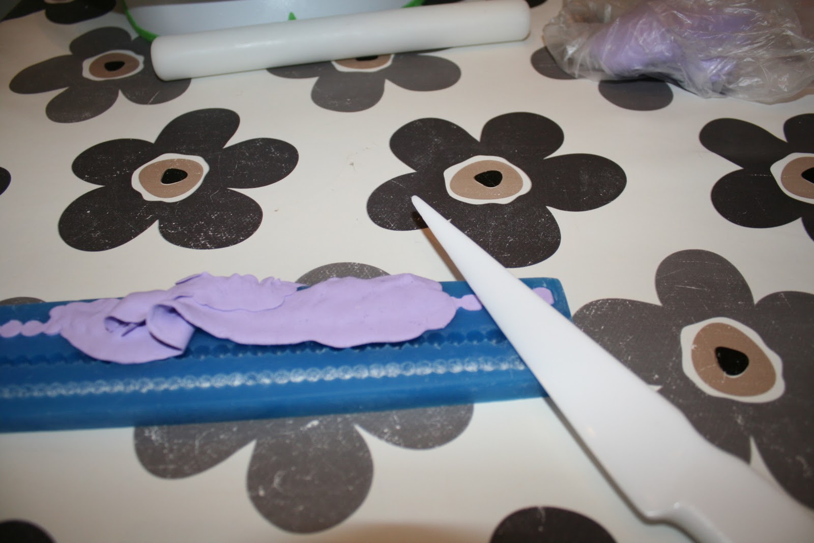 Synes det kan bli litt svakt mønster med disse mattene så jeg bruker ofte å gå over med et sånt skjærehjul som ikke skjærer gjennom fondanten men bare lager mønster. Å på denne kaken ville jeg i tillegg ha en prikkete linje så da gikk jeg over hele kaken med dette hjulet