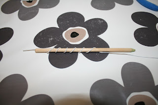Jeg har brukt streng som skal brukes på kake, det er et tynt voks/tape lag utenpå stålstrengen. For å få en spiralform på strengen tvinner jeg den rundt en blyant eller lignende med passe tykkelse. Bare dra den sakte av etterpå. Sånn kan man gjøre med marsipan også, bare trill en tynn pølse og tvinn den rundt et sugerør eller lignende som den slipper lett fra. La den tørke å dra den forsiktig av