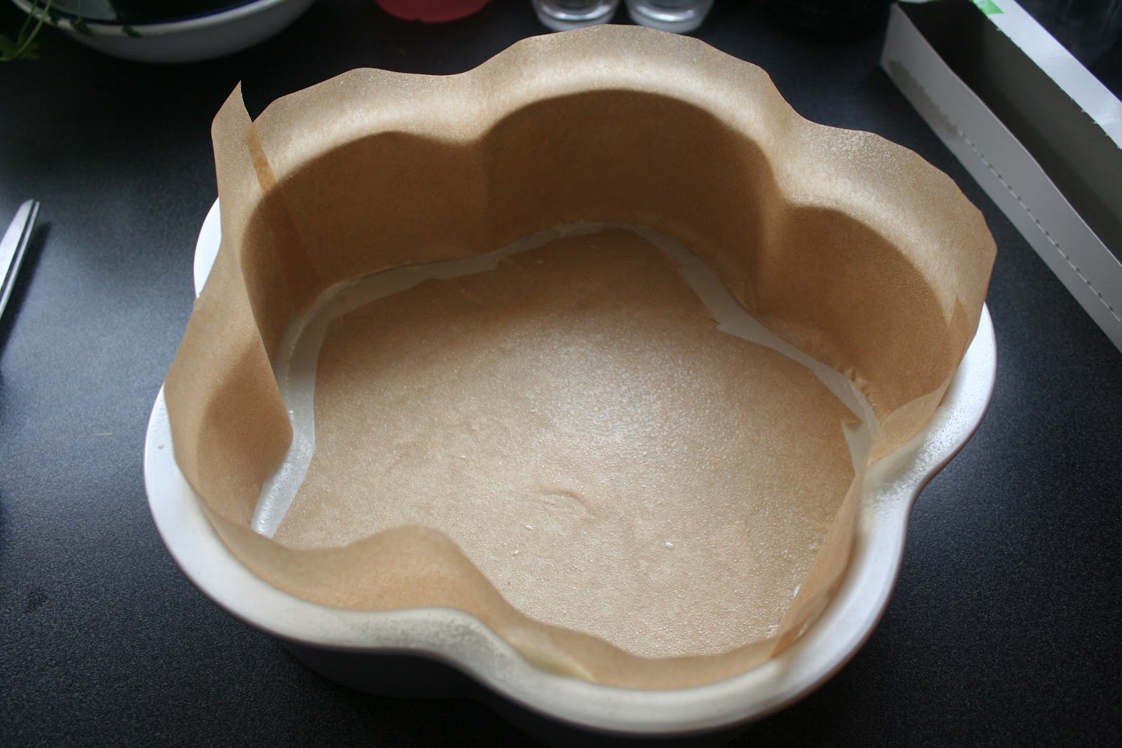 Jeg sprayer den med formfett og kler den med bakepapir, og sprayer igjen…