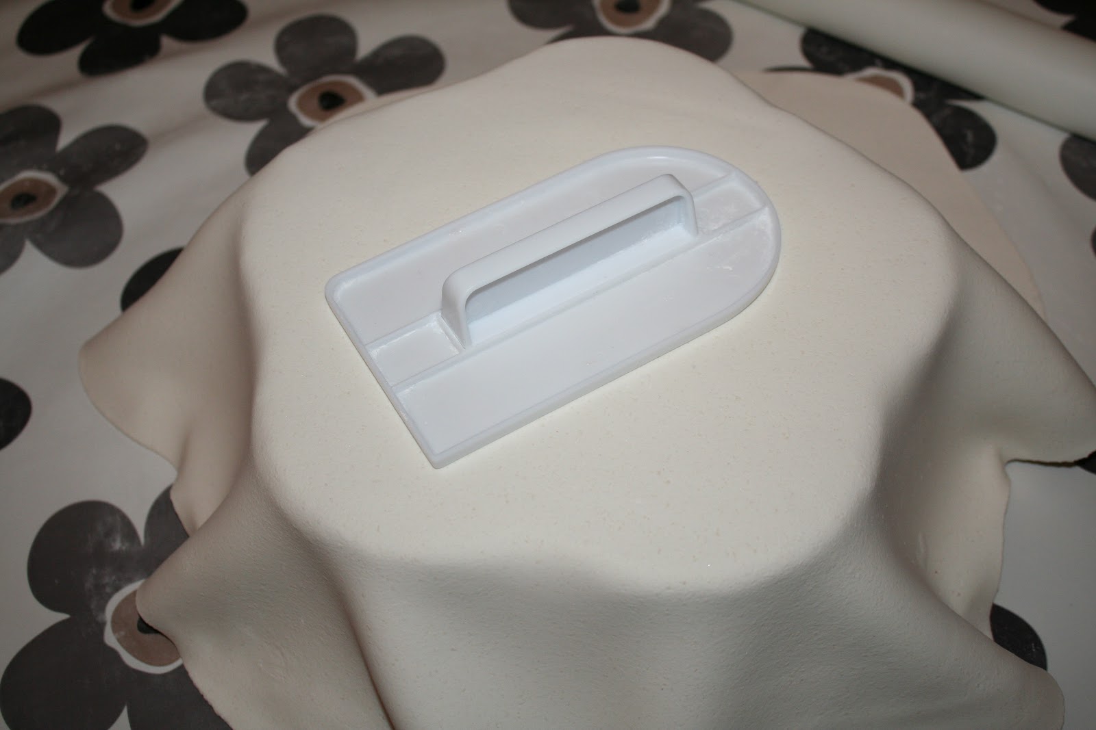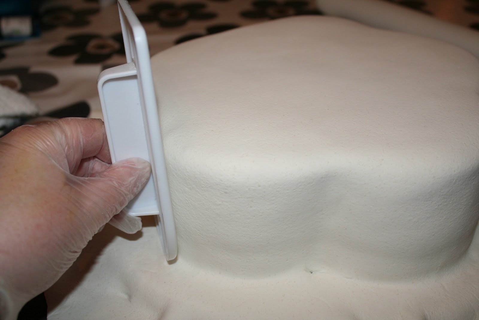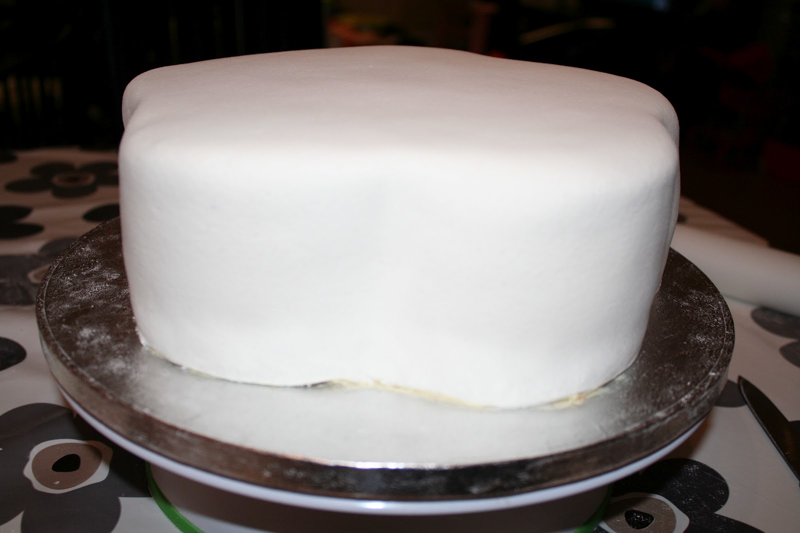 Start med å klemme inntil og dra hånden nedover. Gjør dette hele veien rundt. Dra litt i marsipanen for å unngå folder når du jobber med hånden nedover. Denne teknikken fungerer for meg, men prøv deg fram og finn din egen teknikk. Viktigste er å unngå skrukker og folder… Å ha på hansker er veldig lurt