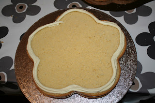 Jeg bruker smørkrem som dik. Denne smørkremen er sjokolade smørkrem tilsatt hvit sjokolade. Sprøyt ut en kant hele veien rundt. Her kan man bare klippe av en sprøytepose og klemme ut eller bruk en tipp inni. Jeg setter den i kjøleskapet i 10-15 min til diken er stivnet