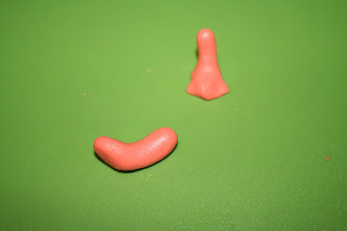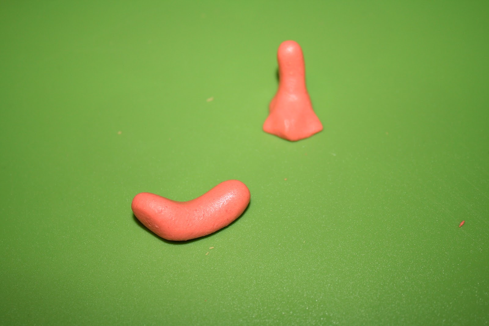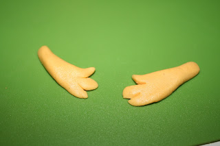 Her har jeg brukt litt orange marsipan, gul, litt hvit og litt blå til svømmebrillene. Starter med å lage beina. Trill 2 orange kuler