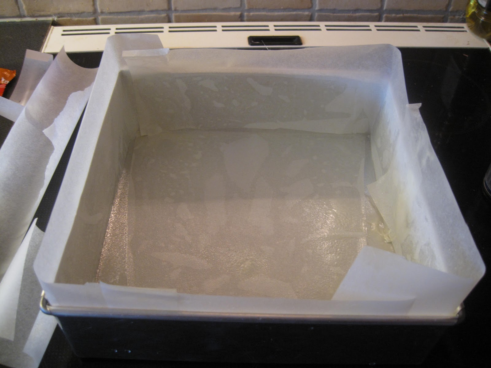 Jeg bruker å kle formen med bakepapir i bunnen og oppover sidene så det stikker opp litt over formen. Klipper til remser med bakepapir og sprayer formfett i skjøtene for å «lime» overlappingen sammen. Sprayer godt med formfett etterpå også