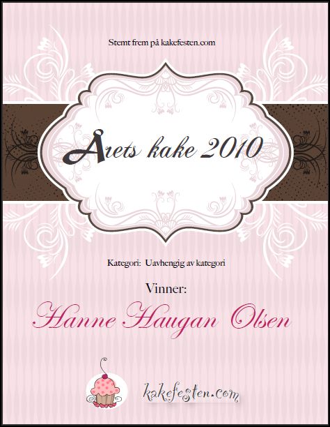 Som sikkert mange av dere har hørt tidligere så vant jeg Årets kake 2010 på www.kakefesten.no Dette synes jeg var stor stas! Å spesielt stolt ble jeg over at jeg vant med kaken jeg laget til vår minste datters barnedåp:-) Kakefesten er forresten et flott forum for oss kakeinteresserte, så har du ikke vært der, ta en titt innom:-)