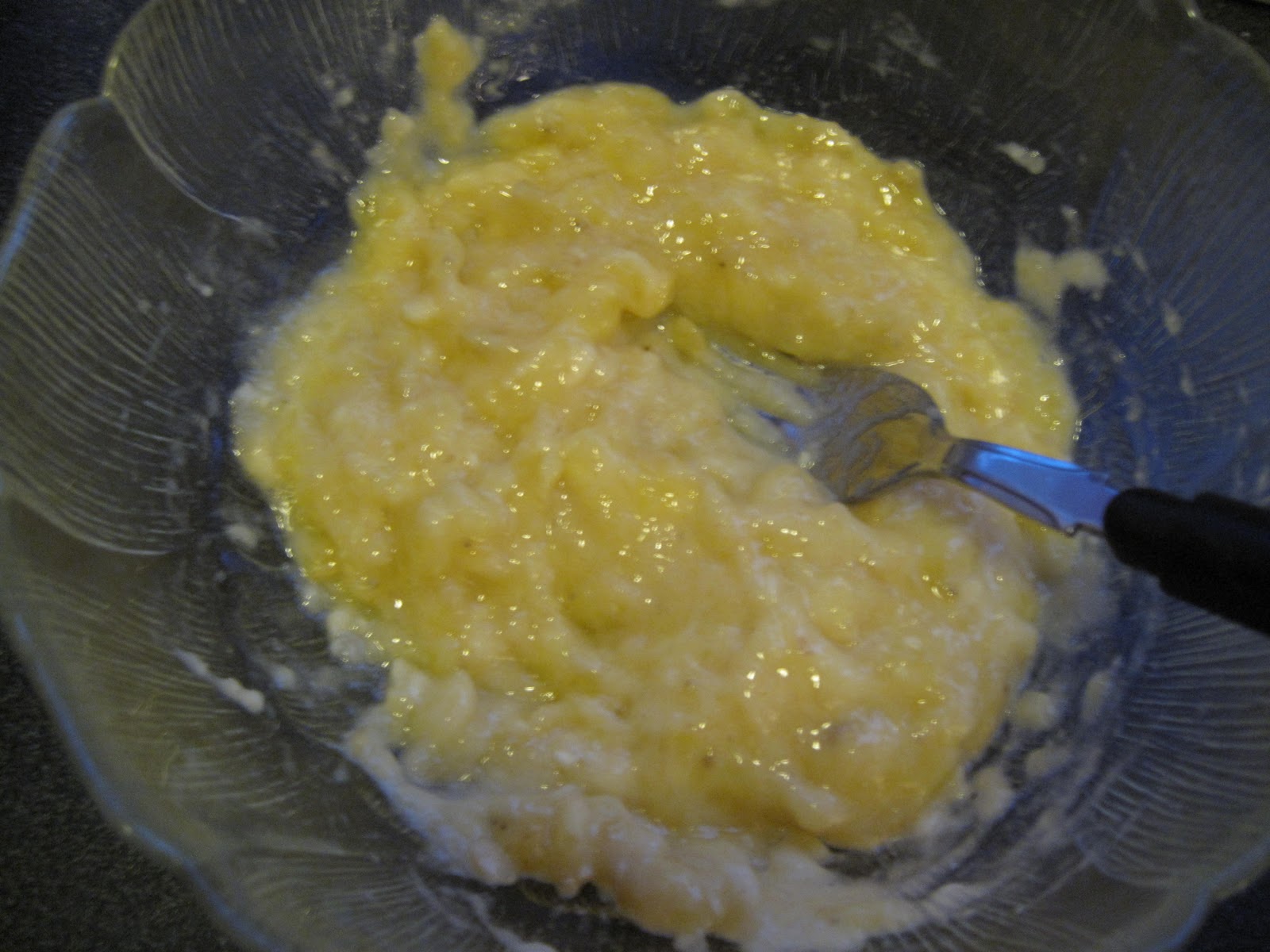 Til den ene halvparten skal jeg ha banan, mos den med en gaffel. Gjør ikke noe om det er litt biter bare godt det 🙂