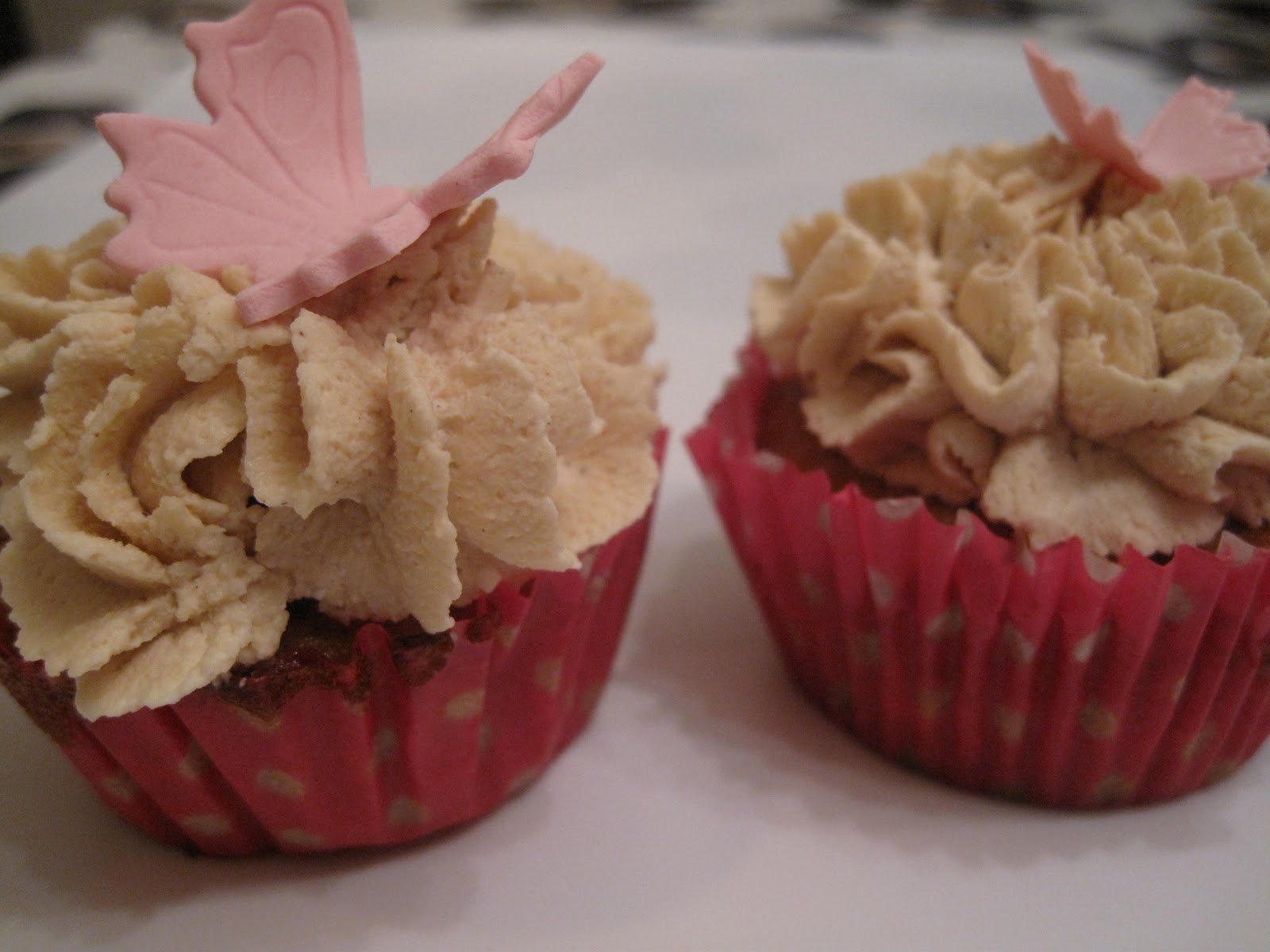 Banan cupcakes pyntet med sommerfugler i marsipan… Barna syntes de med banan var best uten krem og det er jeg nesten enig i… 😉 Så server gjerne noen uten krem også! Evt. ikke ha kaffearoma i kremen…