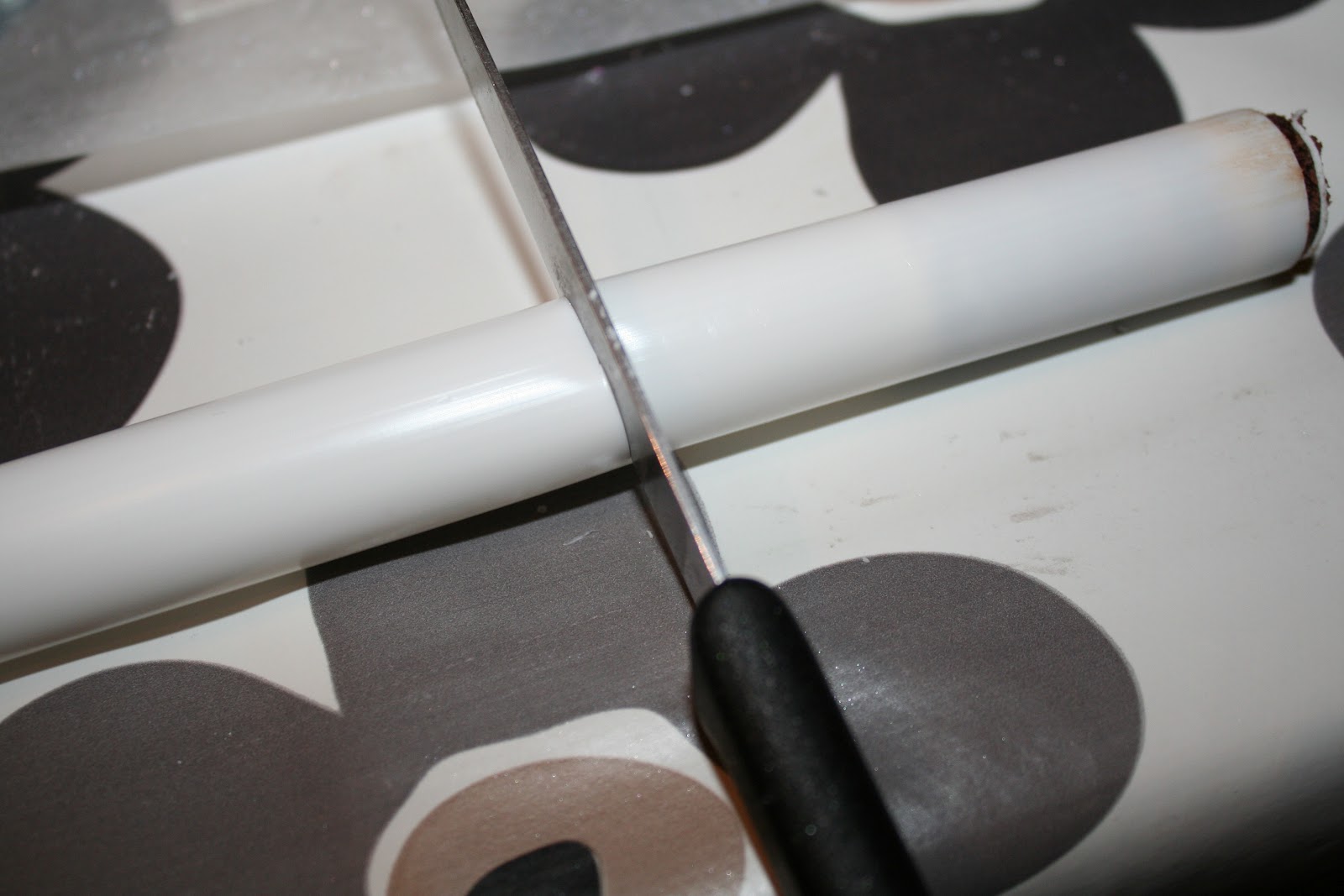 Sett røret nedi, stikk kniven inni så du vet hvor du skal skjære. Røret skal være bitte litt høyere enn kaken. For kaken skal hvile på rørene ikke på kaken. Men blir det for høyt så kan kaken over gli av også… Så det beste er om røret tar vekten men at den er litt i kontakt med selve kaken også. Så jeg legger kniven ned på kaken og stikker inn et merke, da er den bitte litt høyere…