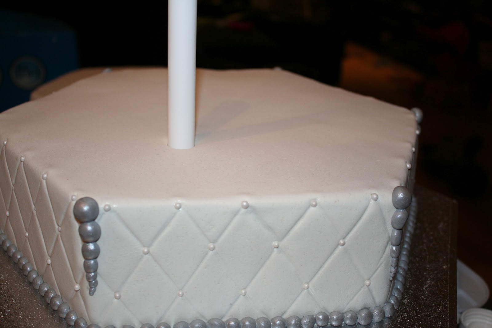 Så settes kaken oppå. Pass på at den fineste siden kommer frem og at den står beint oppå kaken under. Jeg laget diamantmønsteret på kaken før jeg begynte å stable. Men siden man skal holde litt i kaken når man skal sette den oppå den andre er det lurt å vente med det meste av pyntingen