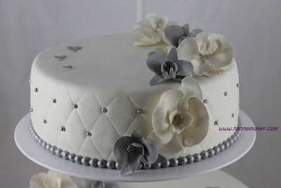 Brudeparet hadde sett denne kaken som jeg har laget tidligere og ønsket seg noe lignende men i hvitt og sølv istedet 🙂 Stativet er Wilton sitt floating tire