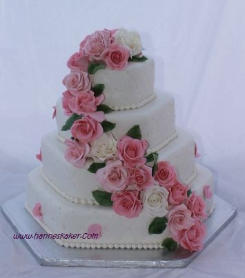 Cathrine og Morten hadde sett at jeg hadde laget en hvit bryllupskake med hexagon formene og med lilla roser. De ønsket seg noe tilsvarende, men med rosa og hvite roser istedet. Så sånn ble da resultatet 🙂