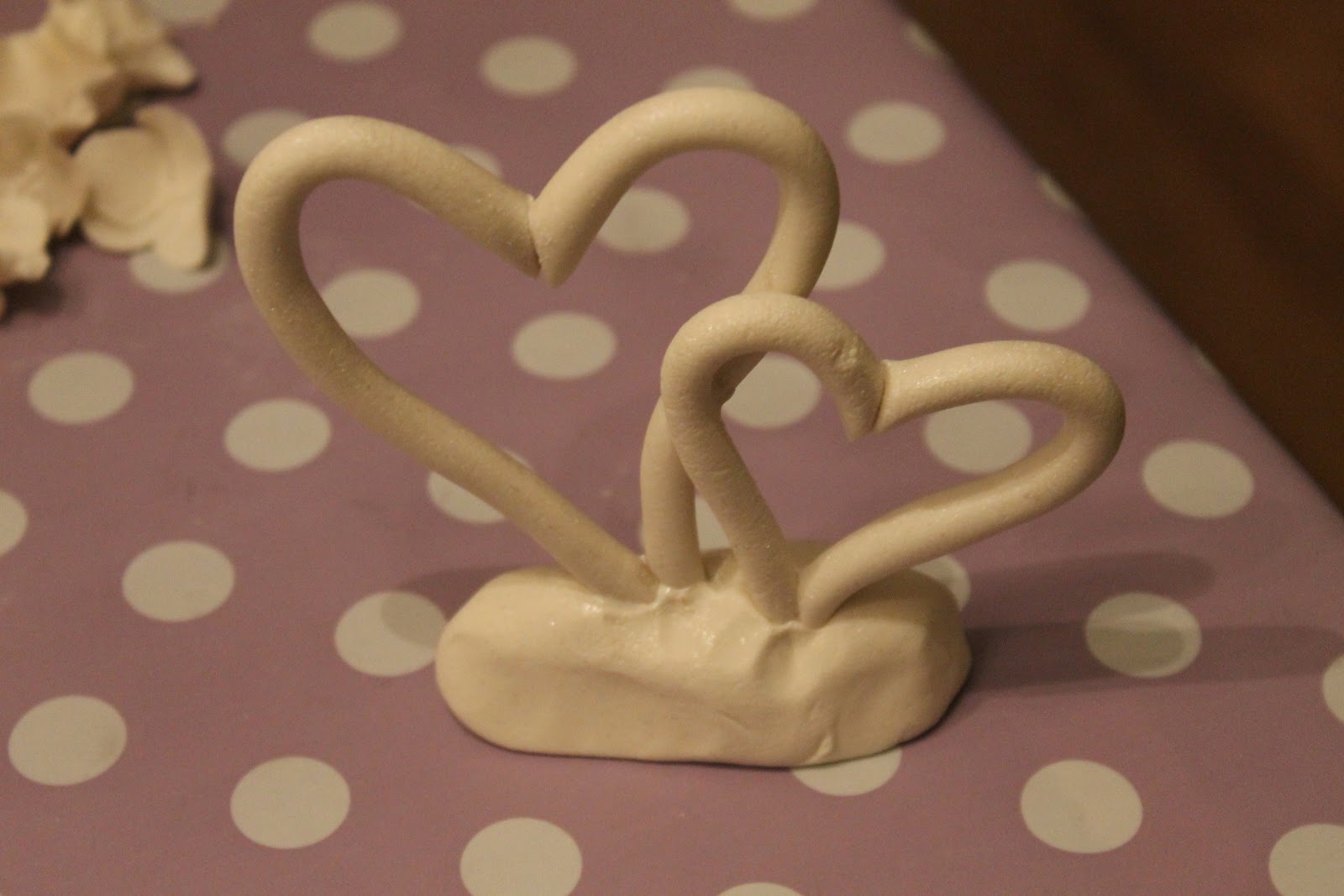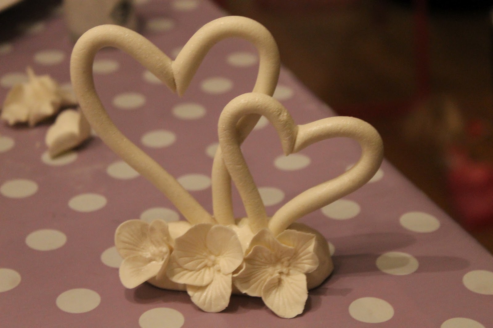 Orkideène og hortensia blomstene laget jeg noen dager tidligere pga. at de skulle tørke i fasong. Trinn for trinn på Orkidè finner du her 🙂 Hjertene på toppen trenger også noen dager å tørke på så de holder fasongen når de settes opp. Jeg trillet ut marsipan i tykkelsen jeg ønsket og formet de til hjerte. Lot de tørke flatt på bakepapir, snudde de engang i blant. Den trenger nok med fordel 3 dager ca med tørking. Haster det mye å få ferdig pynten kan man bruke Mexican Paste da det tørker fort. Samme med blomsterpasta.