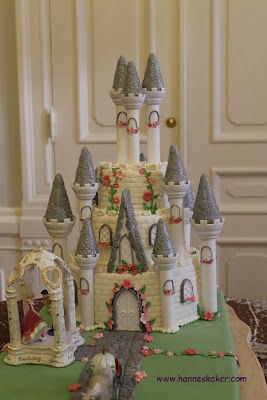 Slottet, dette er Wilton sitt slottoppsett. Nederste kaken er 30 cm, midten 20 cm og øverst 15 cm. Inni er det Annas favoritt sjokoladekake med hvit sjokolade, melkesjokolade og mørk sjokolade smørkrem. Tårnene, døren, vindu og den over døren er plast. Plast tårnene er kledd med grå fondant på toppen og jeg har penslet på sølvpulver og limt på litt kakestrø i sølv