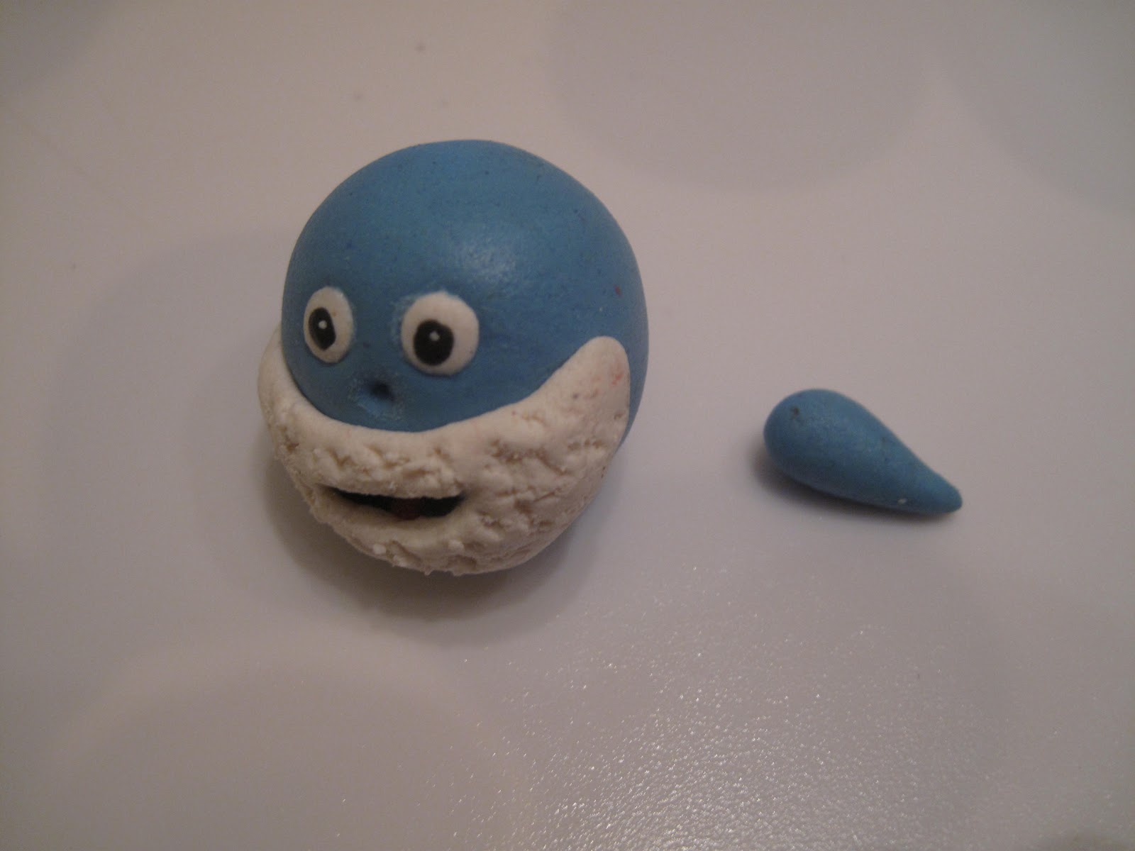 Trillet hvite kuler til øyne, så stakk jeg ut det svarte med en liten tipp. Kan også trille en liten svart kule å klemme flat. Å en bitte liten hvit prikk i øyet til slutt. Fylte munnen med litt svart og litt rød for å illustrere tunge