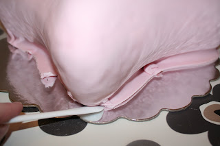Skjær bort fondanten kant i kant med formen. Bruk en plastkniv eller baksiden på en kniv så du ikke skjærer i stykker formen…