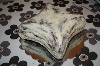 Så legges neste kake halvdel oppå. Nå ligger den opp/ned på en måte… Smør utover smørkremen