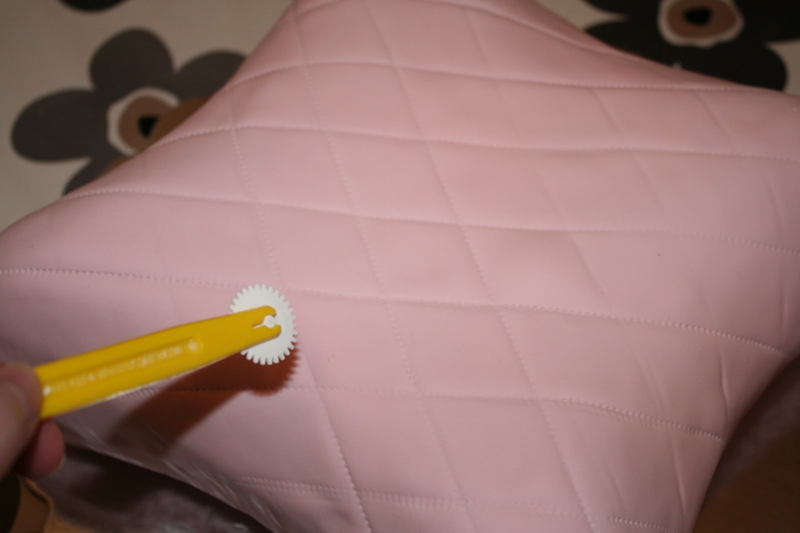 Synes det kan bli litt svakt mønster med disse mattene så jeg bruker ofte å gå over med et sånt skjærehjul som ikke skjærer gjennom fondanten men bare lager mønster. Å på denne kaken ville jeg i tillegg ha en prikkete linje så da gikk jeg over hele kaken med dette hjulet