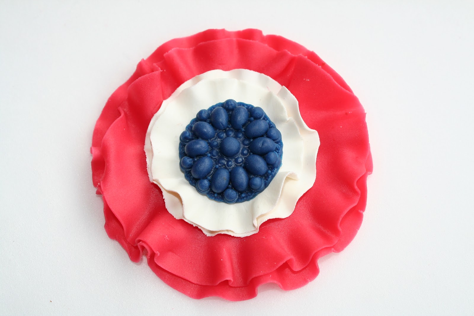 Tips: Har du ikke sånn silikonform til å lage medaljonger kan du lage et sett med blå rysjekanter også i midten. Eller bare en blå kule i midten. Denne rosetten kan lages i mange forskjellige størrelser, alt etter hvor stor du vil ha den 🙂