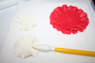 Så resten av rosetten. Bruk en rund utstikker og stikk ut en runding. Veldig kjekt med et sånt sett med mange rundinger i samme boks. Dette fåes kjøpt på bl.a. www.kakeboksen.no eller på Traktøren bakeutstyr i Trondheim. Hvis du ikke har en sånn bruker du bare en skål eller et glass