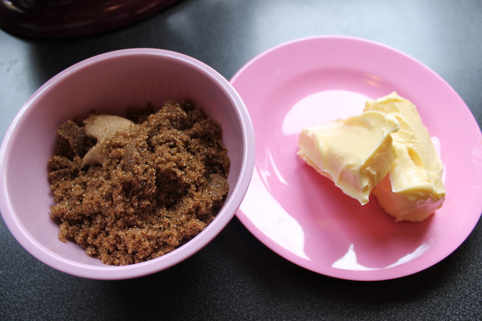 Start med å finne frem romtemperert smør og brunt sukker. Jeg brukte ca halvparten lyst og resten sånn vanlig brunt sukker (brun farin) man kan kjøpe i butikken. Utenlandske butikker selger lyst sukker, sånn som liksom kleber litt sammen… Kjør dette i mikseren til det blir litt fluffy