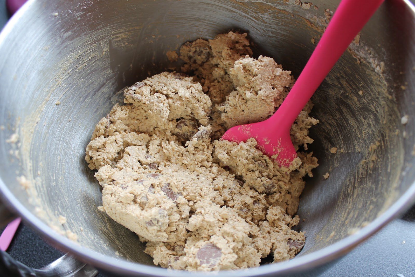 Kle en bakeplate med bakepapir. Ha røren utover, veldig kjekt med en sånn isskje da. Litt usikker på hvor stor min størrelse er, for den har jeg «knabbet» fra min mors skuffe… Men den er ikke så stor. Hadde jeg brukt skje hadde jeg villet hatt 2 ss røre ca til hver cookies. Men her lager man så store eller små cookies man vil, bare de er ca like store så de stekes samtidig. Reguler heller med hvor mange min de stekes utifra størrelse