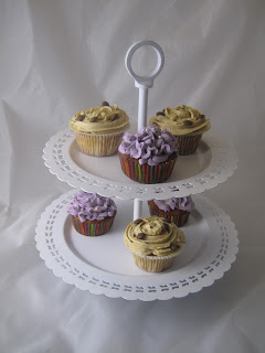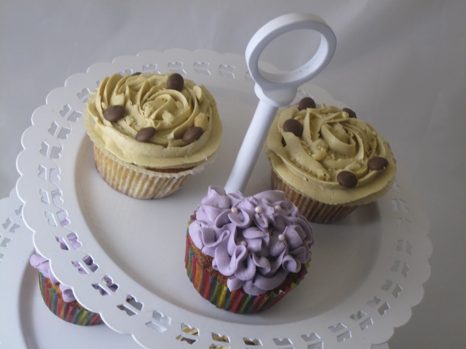 Pyntet de lilla med litt rosa perler… Kaffe latte cupcakesene ble pyntet med hakket peanøtter og melkesjokoladeknapper. Stativet var jeg så heldig å vinne i en vervekampanje for bladet Kamille, synes det er så lekkert:-)