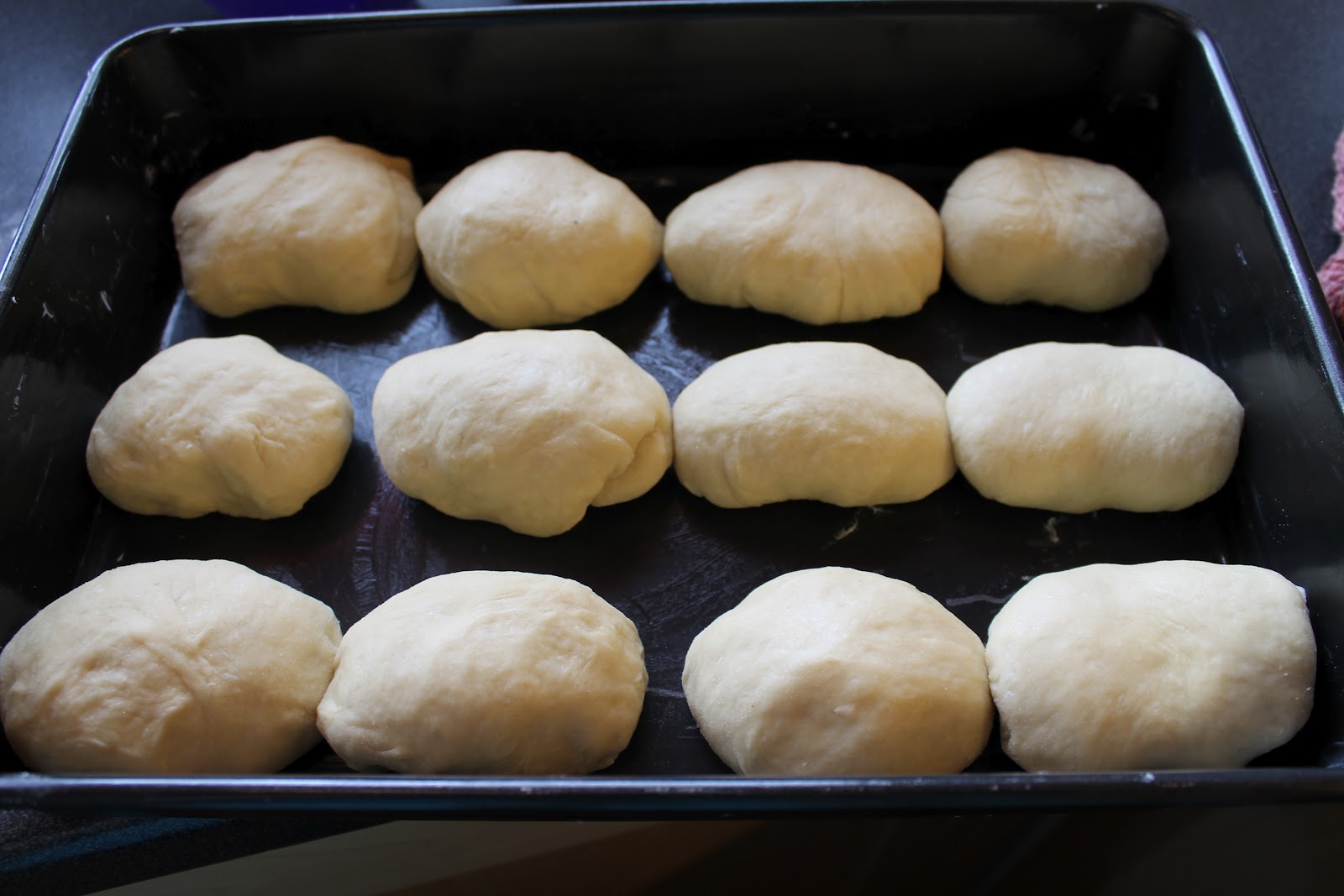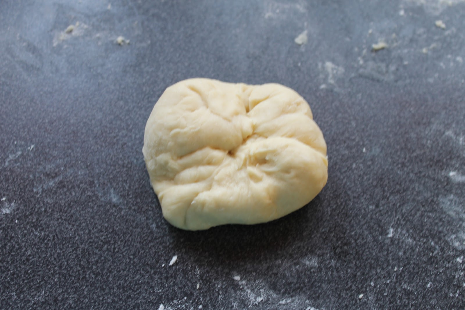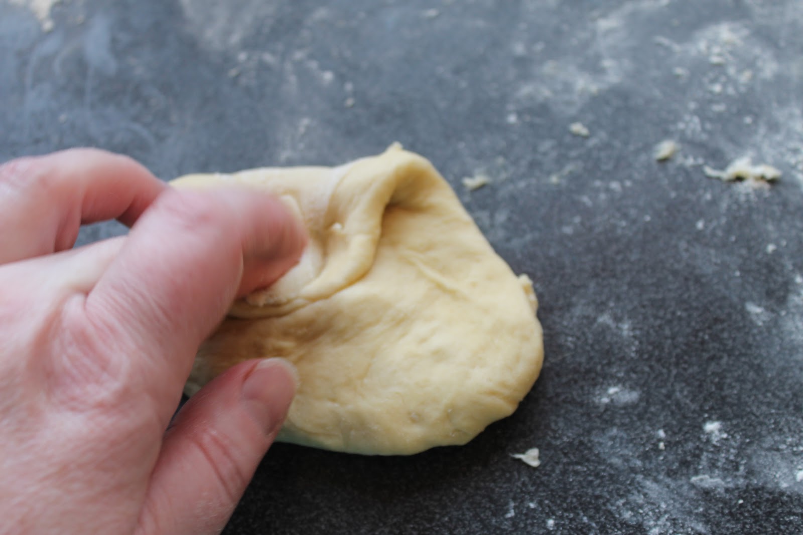 Så skal vi forme Dinner rolls. Klem den først litt flat og brett så inn på ene siden