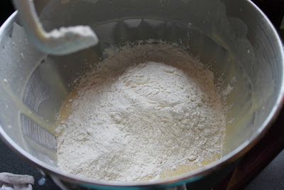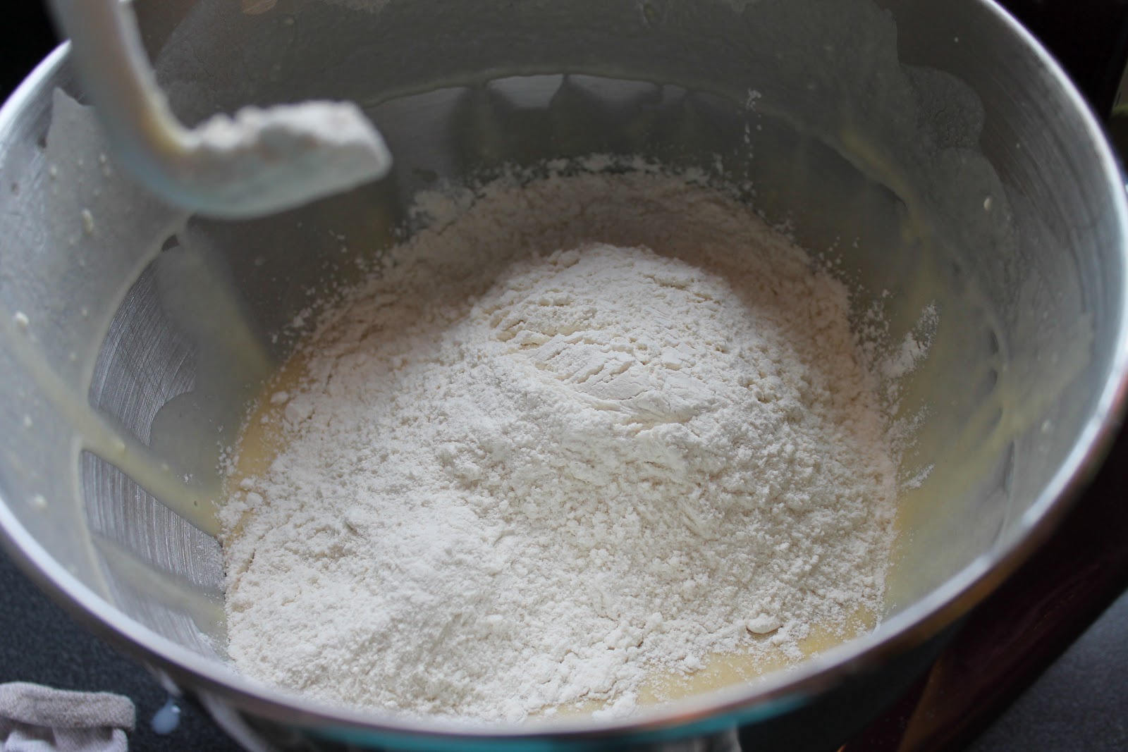 Når smør – melkeblandingen er blitt fingervarm tilsettes ca 1/3 del av melet