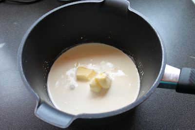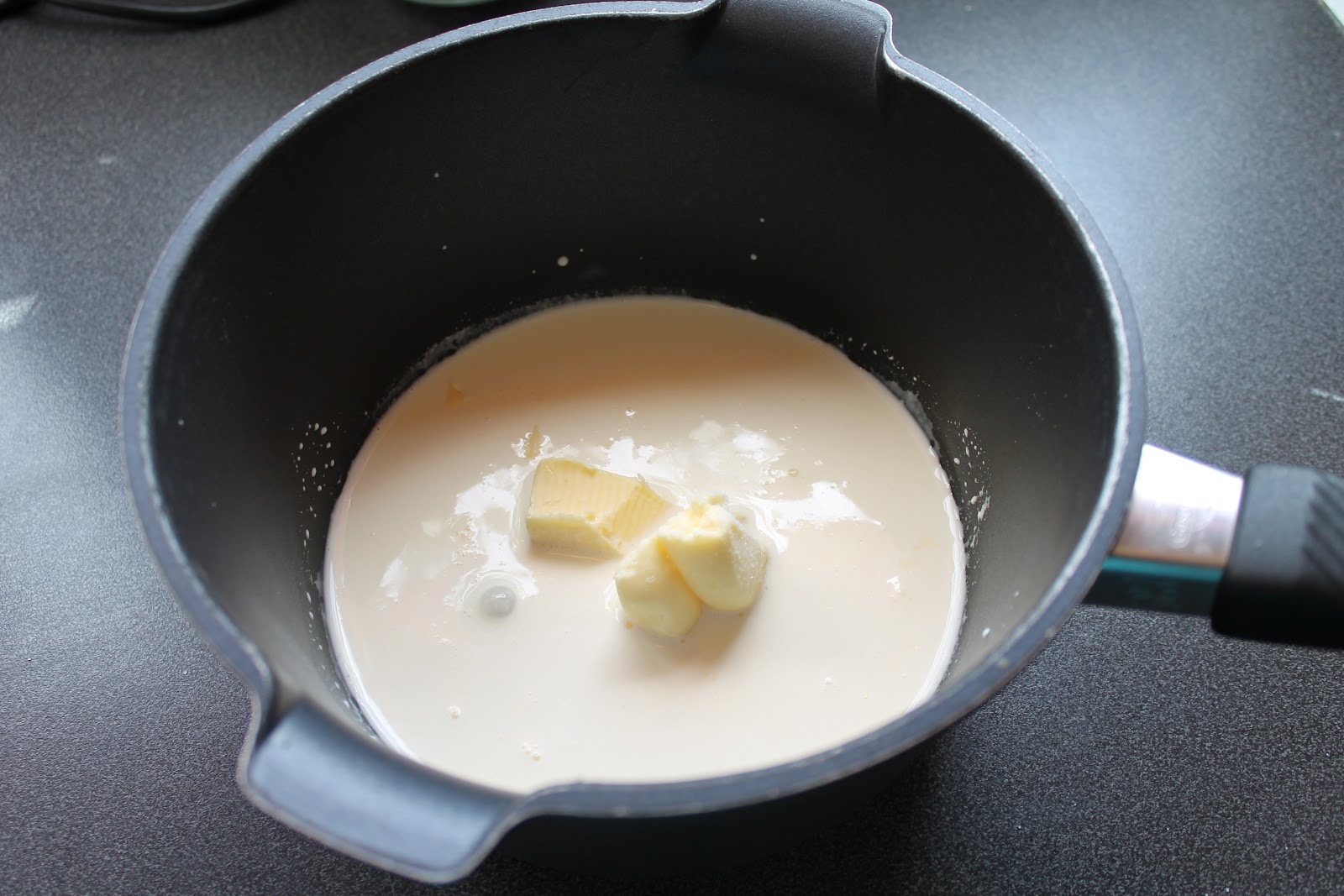 Ha melk, jeg brukte 1 dl fløte og resten lettmelk (hadde en skvett fløte som måtte brukes opp ;)), smør og 65 gram sukker i en kjele. Jeg bruker bestandig meierismør når jeg baker, er ikke noe glad i margarin… Varm dette opp på svak varme til smøret er smeltet, skal ikke koke bare smelte