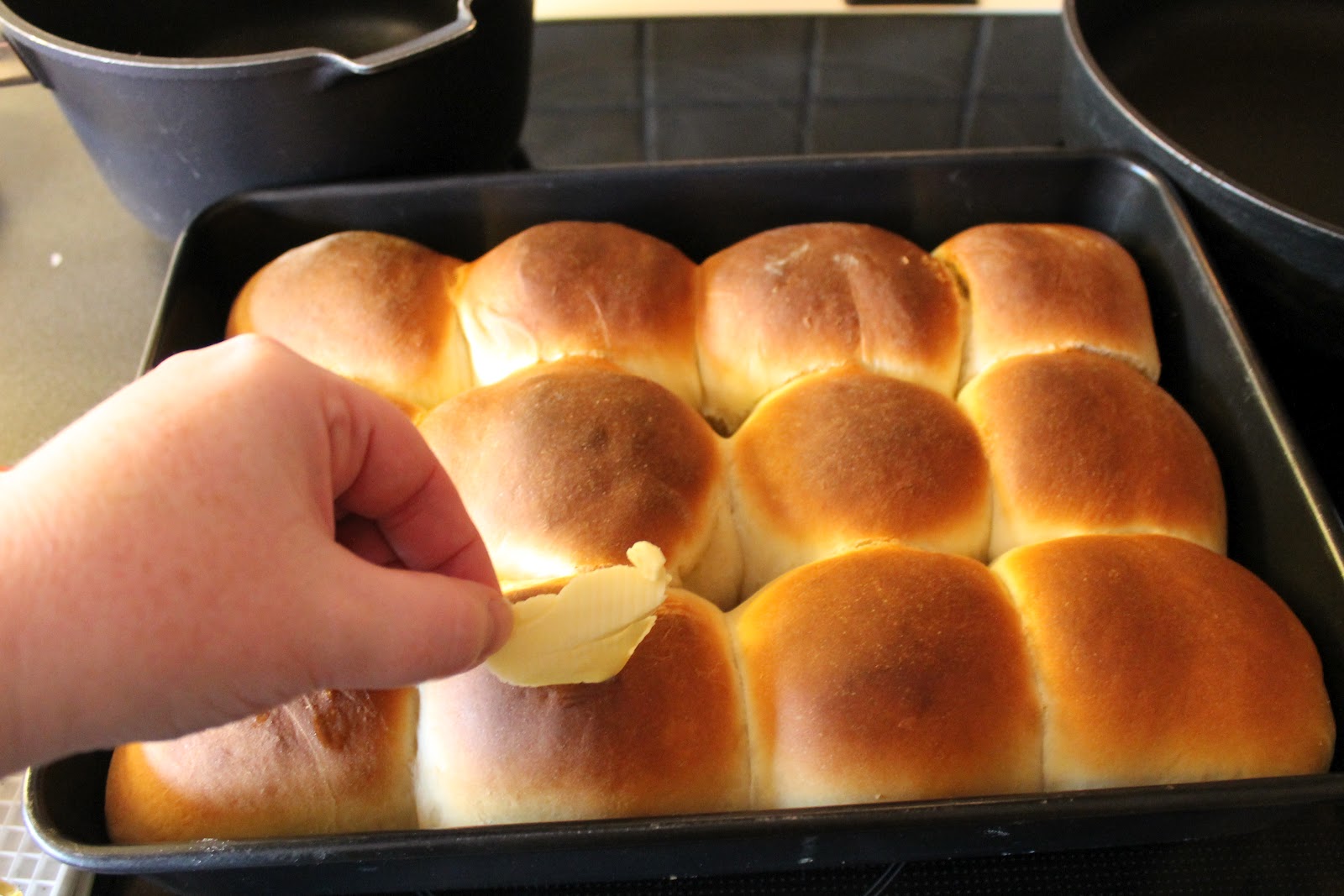 Ta en liten klump kaldt smør og gni dette over rundstykkene med engang de kommer utav ovnen