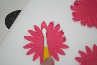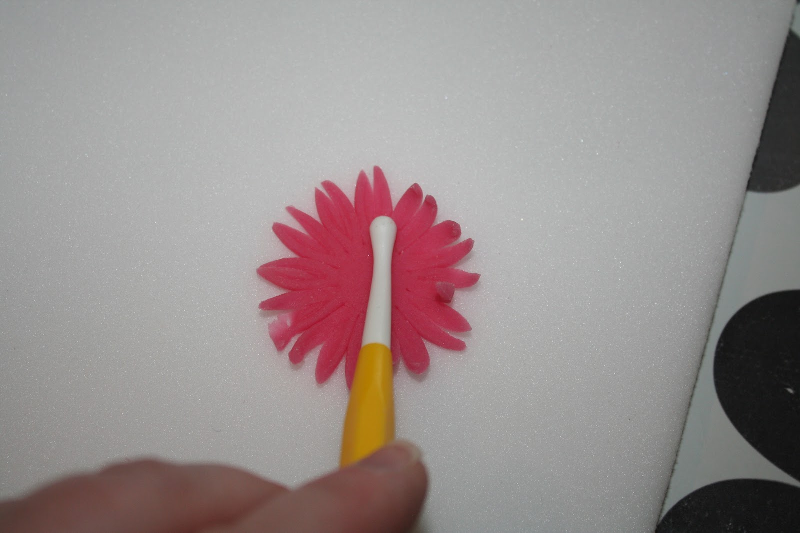Sett bone tool redskapet i enden og dra mot deg mens du presser ned. Hvor mye trykk du skal legge må du prøve deg fram med. Den skal krølle seg litt innover. Dypp bone toolen litt i maizena hvis den fester i blomsten