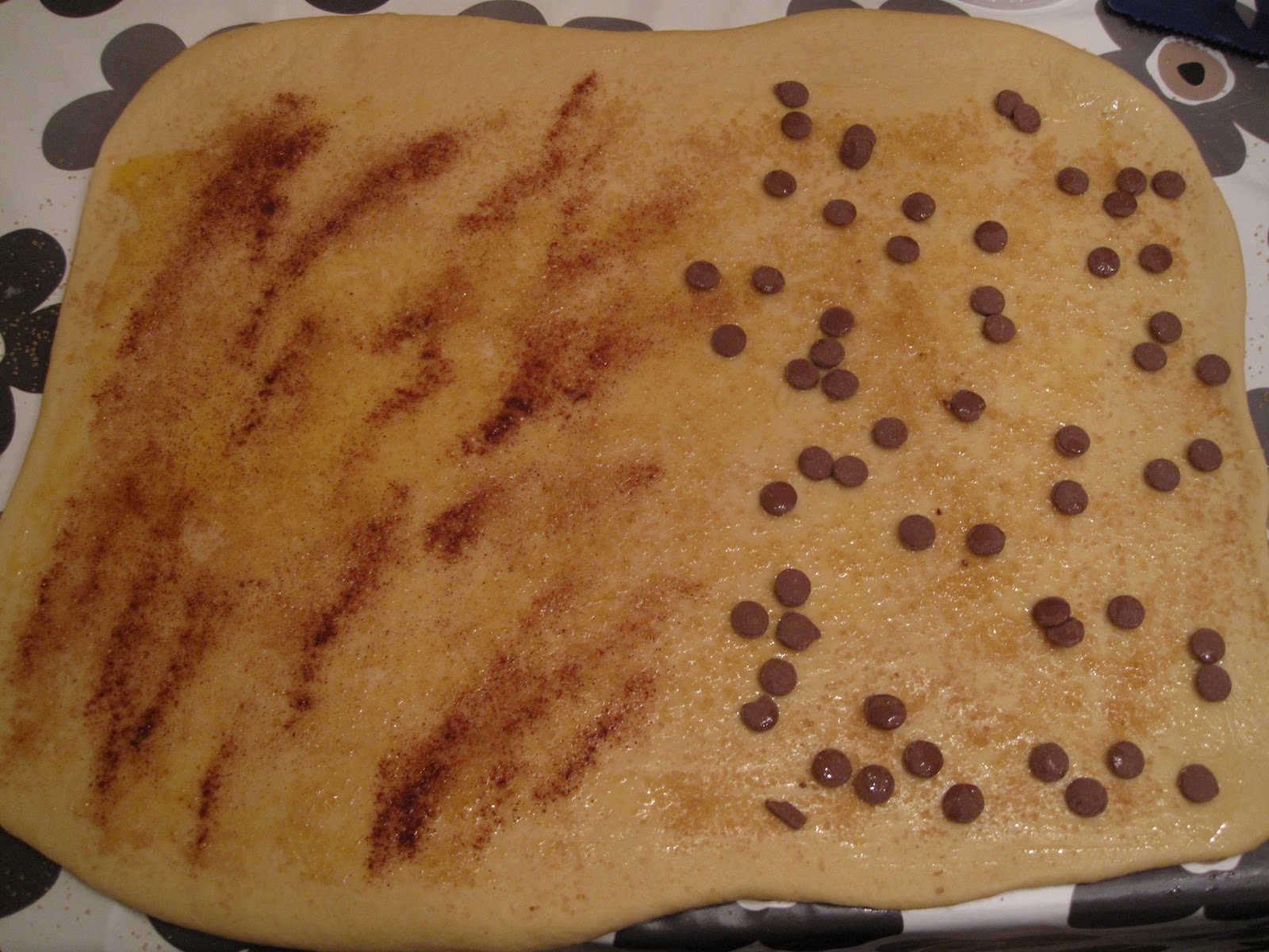 Pensle på smeltet smør. Strø over Demerara sukker (brunt sukker, gir så god smak). På halvparten tok jeg kanel og den andre halvparten tok jeg på melkesjokoladebiter. Barna liker best kanel og mor liker best sjokoladen… Ikke ha noe på den lille øverste biten for da holder den bedre sammen når den rulles