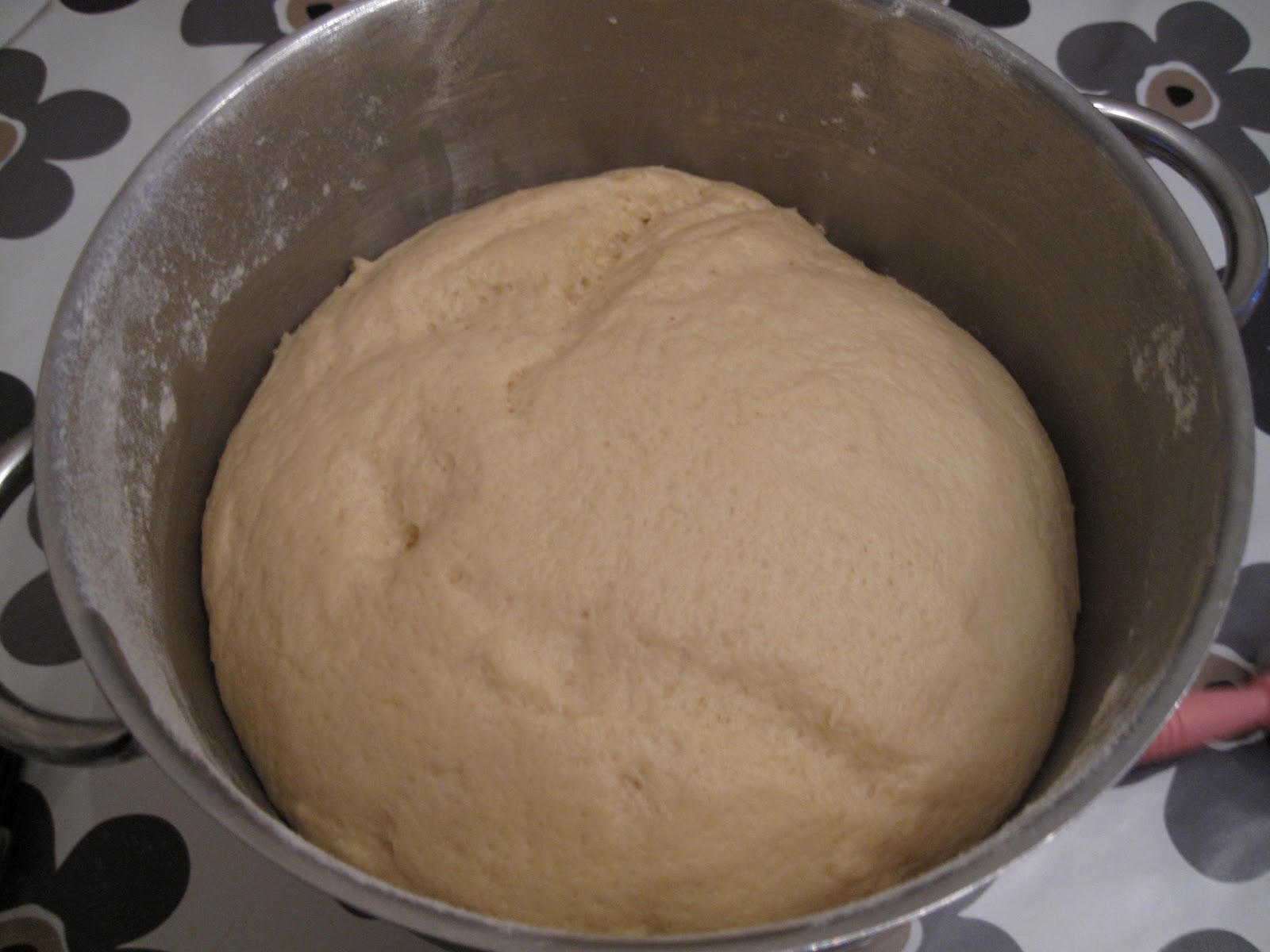 Elt deigen godt sammen i kjøkkenmaskinen, tilsett mere mel hvis den er for klissete. Den er passe når den slipper bollen, men bittelitt klissete likevel… Blir et mye bedre resultat på gjærbakst hvis deigen er heller litt klissete enn for fast… Legg over plastfolie og kjøkkenhåndkle og sett til heving på et lunt sted
