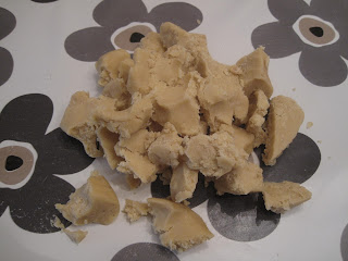 Hvis deigen ikke har vært i kjøleskapet så gjør det nå, 1 time eller mere. Min er kjøleskapskald så da smuldrer jeg den opp så den blir lettere å kna