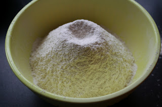 Imens måler man opp hvetemel og potetmel, bland dette godt sammen