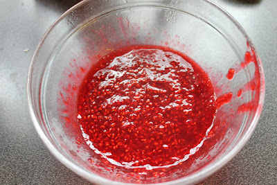 Rør til alt er smeltet. Ha så mere av den kalde bringebær purèn over i denne skåla og rør sammen. Ha så dette over i resten av bringebær purèn og rør det godt sammen