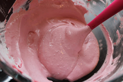 Pisk fløte og bland den lett sammen med bringebær marengsen