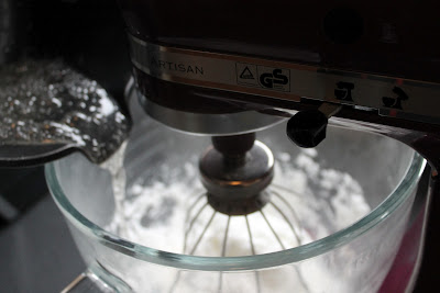 Så helles den varme sukkerlaken ned i de piskede eggehvitene. La maskinen gå på ganske høy hastighet og hell sukkerlaken i kanten av bollen. Ikke treff vispen for da blir sukkerkrystaller kastet mot veggene på bollen og du får lett krystaller i marengsen. Hell det så du ser den treffer marengsen men ikke vispen…