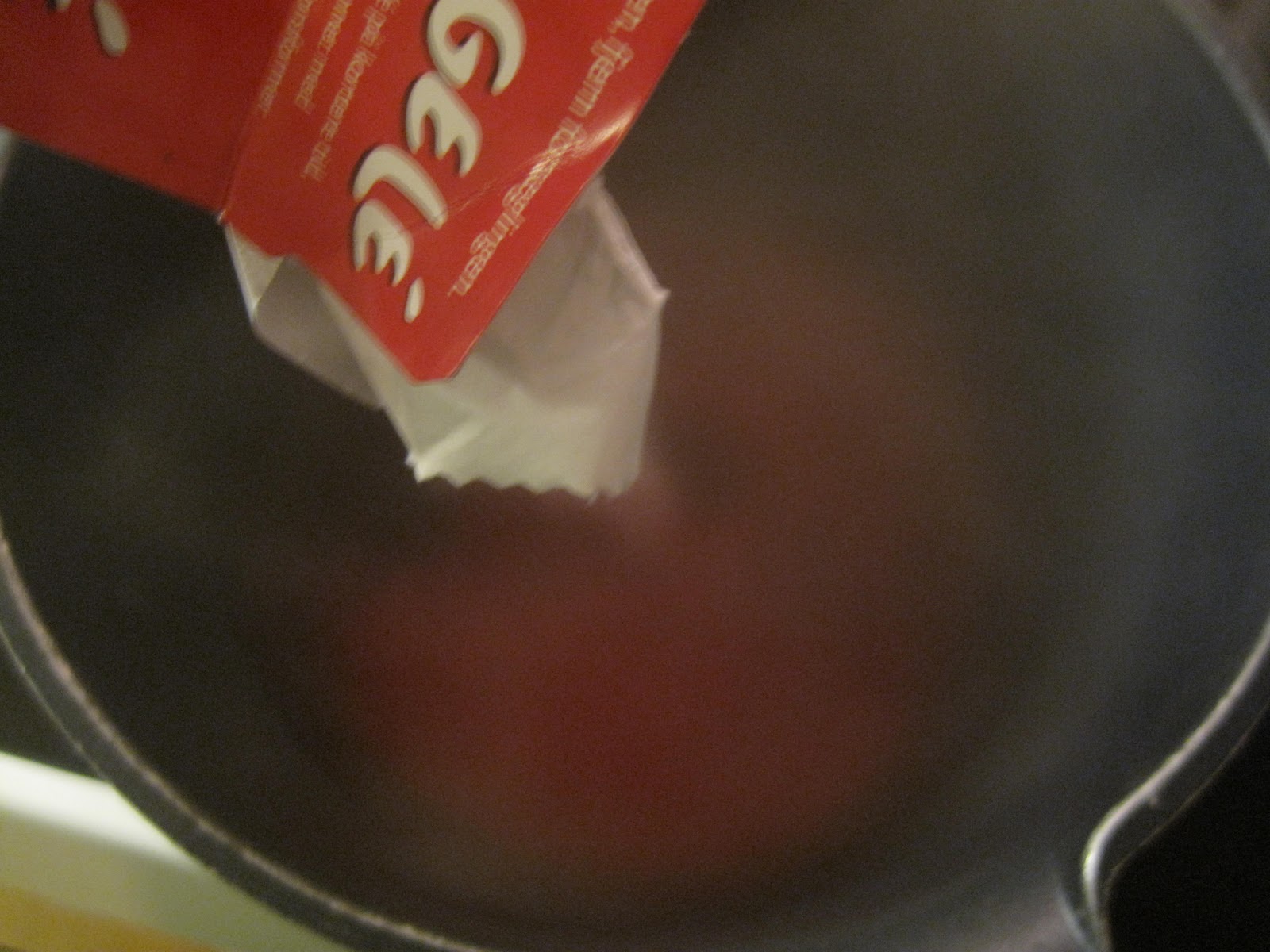 Start med å lage gele etter smak, jeg brukte bringebær. Kok opp 5 dl vann og ha pulveret i, rør godt til det er helt oppløst