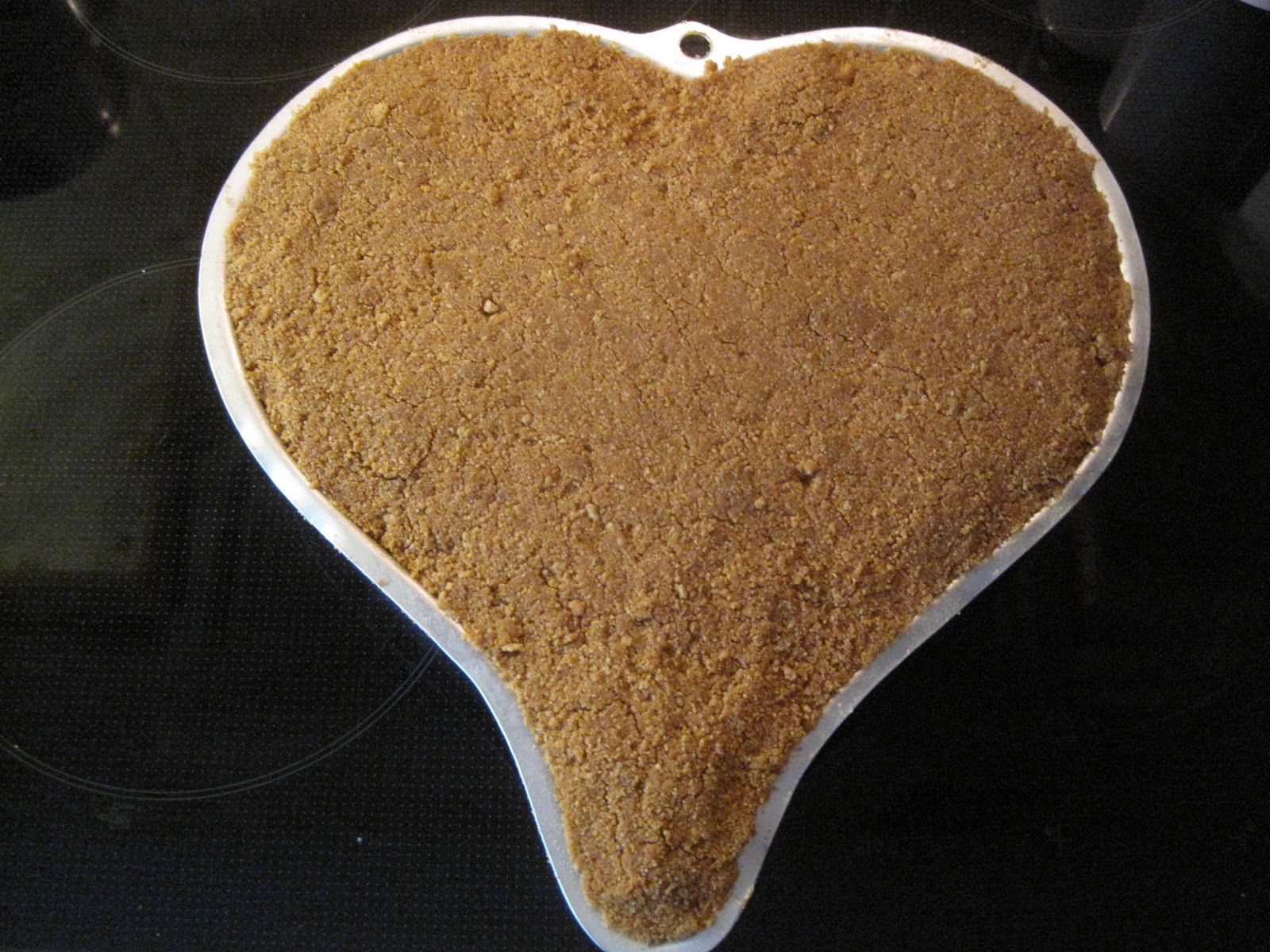 Så skal vi lage kjeksbunnen. Kjør kjeksen helt fint i en foodprosessor og bland med smeltet smør. Legg det oppå den stivnede kremen. Bruk en spatula eller noe lignende for å få et jevnt lag med kjeks. Settes så kaldt igjen