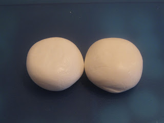 Min pakke skulle være hvit, men var redd for at jeg hadde litt for lite ekstra hvit marsipan fra Pals igjen så jeg farget vanlig butikk kjøpt marsipan hvit med white white fra Wilton. Som du ser på bildet er den til høyre den som jeg farget. Litt vanskelig å få den helt hvit… Det finnes titandioksid pulver som man kan bruke også, fåes bl.a. på Panduro. Har ikke prøvd så vet ikke om det blir hvitere. Jeg blandet ekstra hvit marsipan fra Pals og den selvfargede her og det ble bra:-)