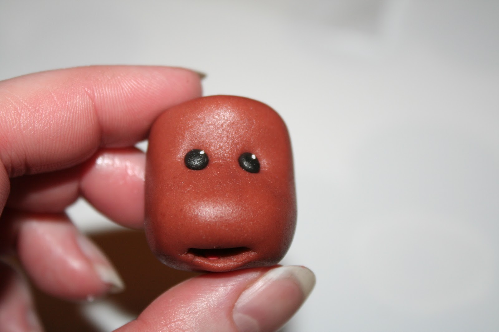 Sett 2 svarte kuler i øynene og en bitte liten hvit prikk. Dette gir et fint «glimt i øyet»