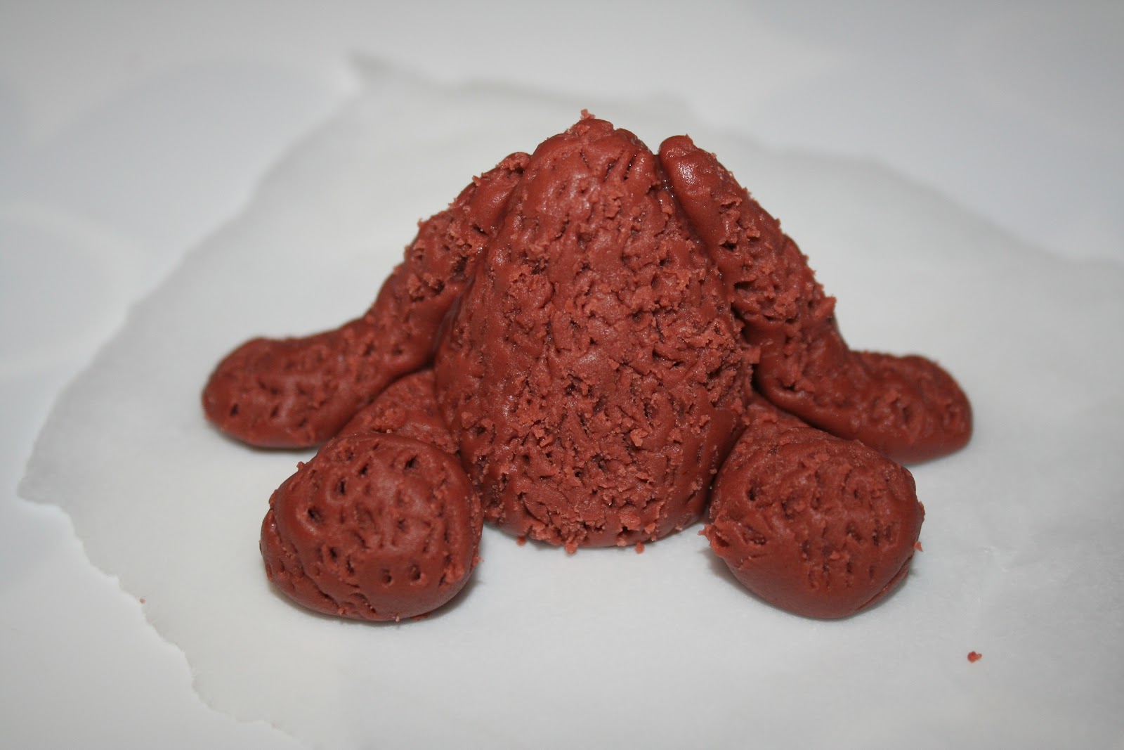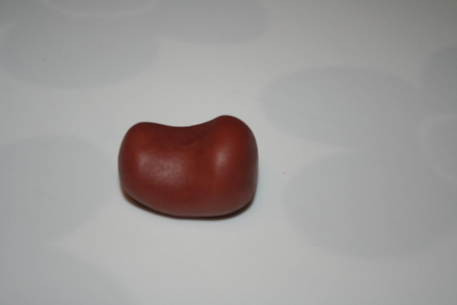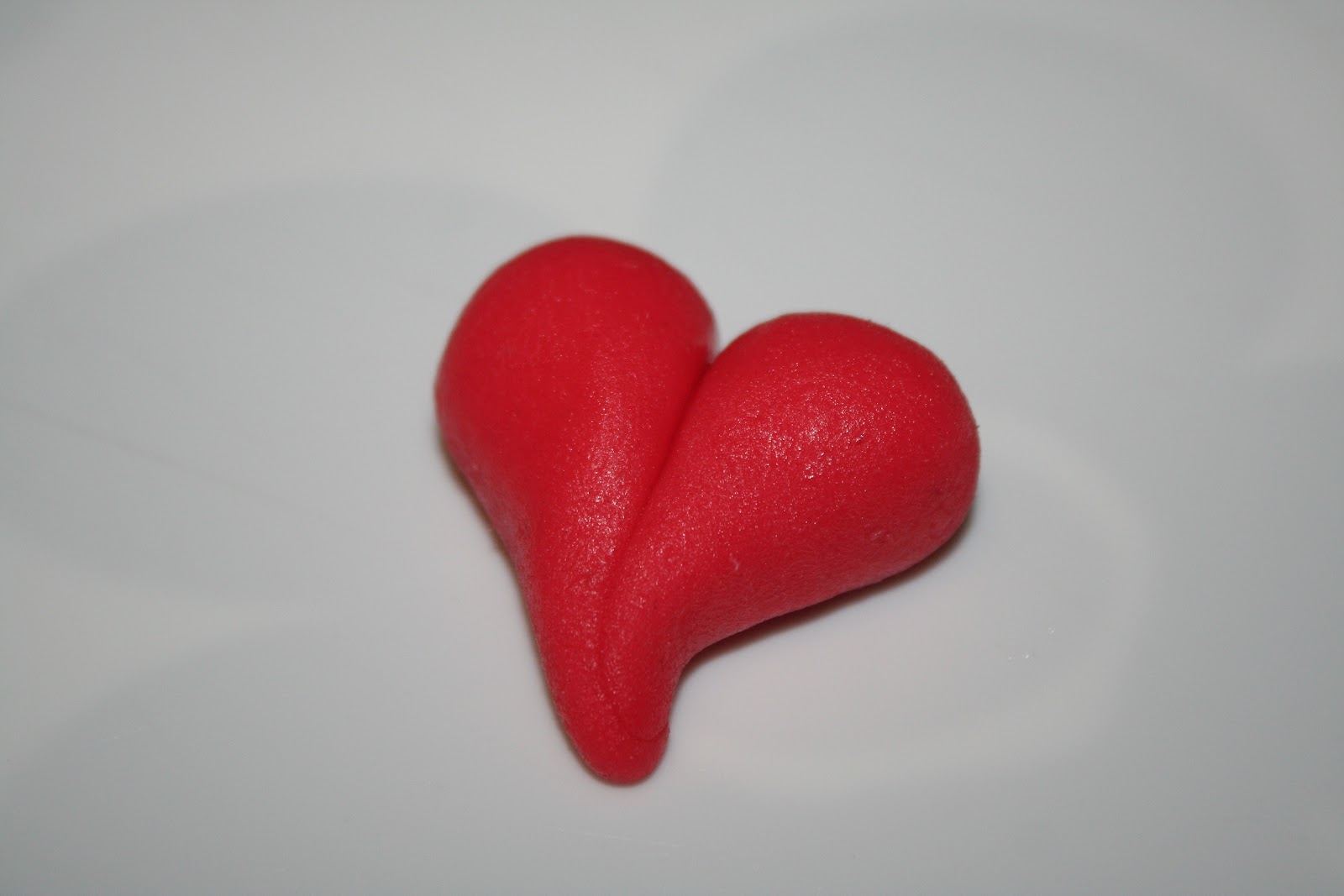 Jeg laget et rødt hjerte og la i fanget hans i anledning Valentine <3 Trill ut 2 røde marsipan biter til dråpeform